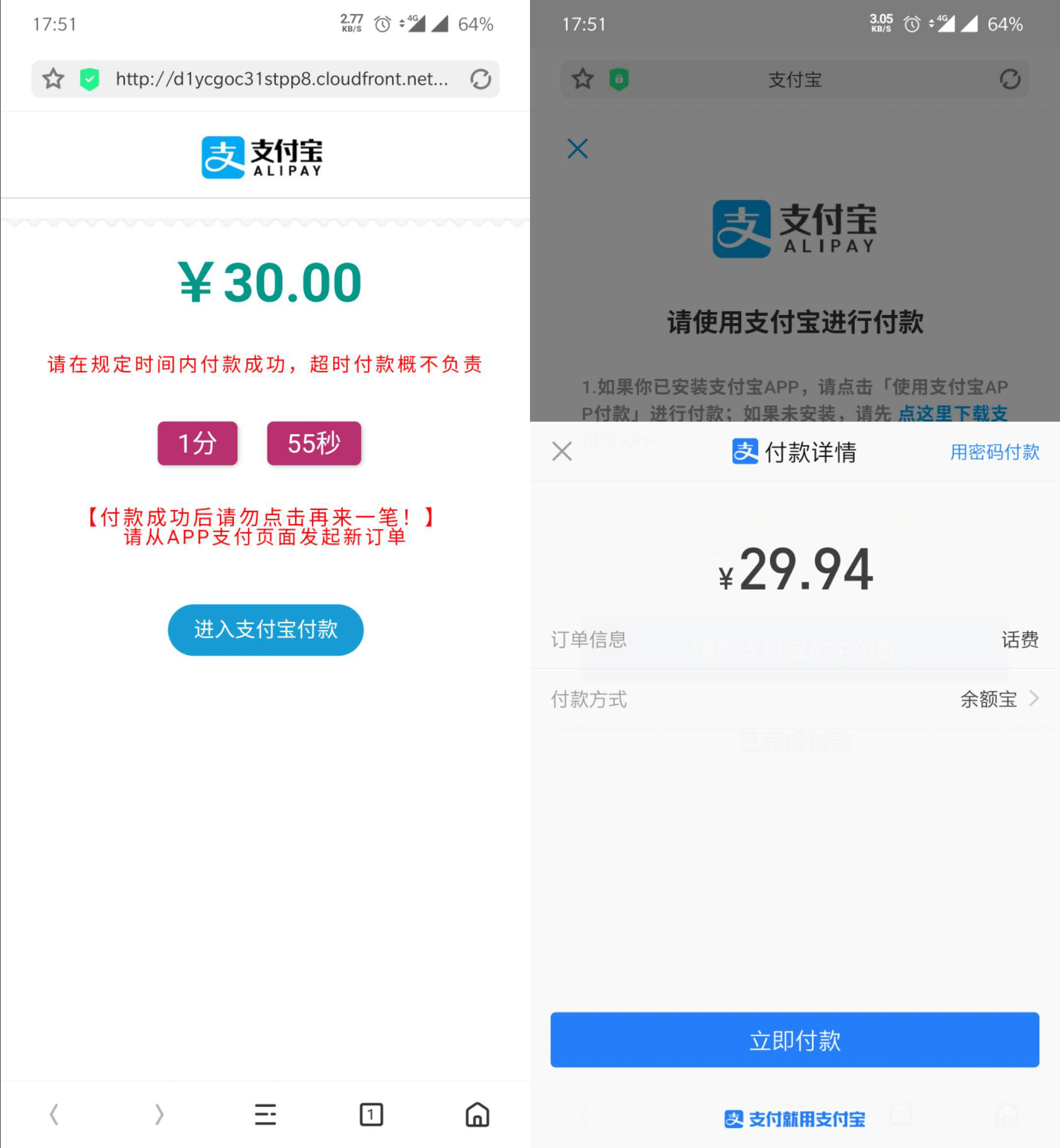 首先会下单然后应该是返回了一个URL然后拉起了原生浏览器。经过了N个重定向后出现了一个页面,然后有个按钮提示进入支付宝支付,点击按钮跳到了支付宝的WEB页面(这里应该走了支付宝的web支付,之前有配合他们实现过这种支付方式)然后拉起支付宝App进行支付,神奇的是这里的订单说明是话费(渠道还是可以的啊话费手续费底啊)。