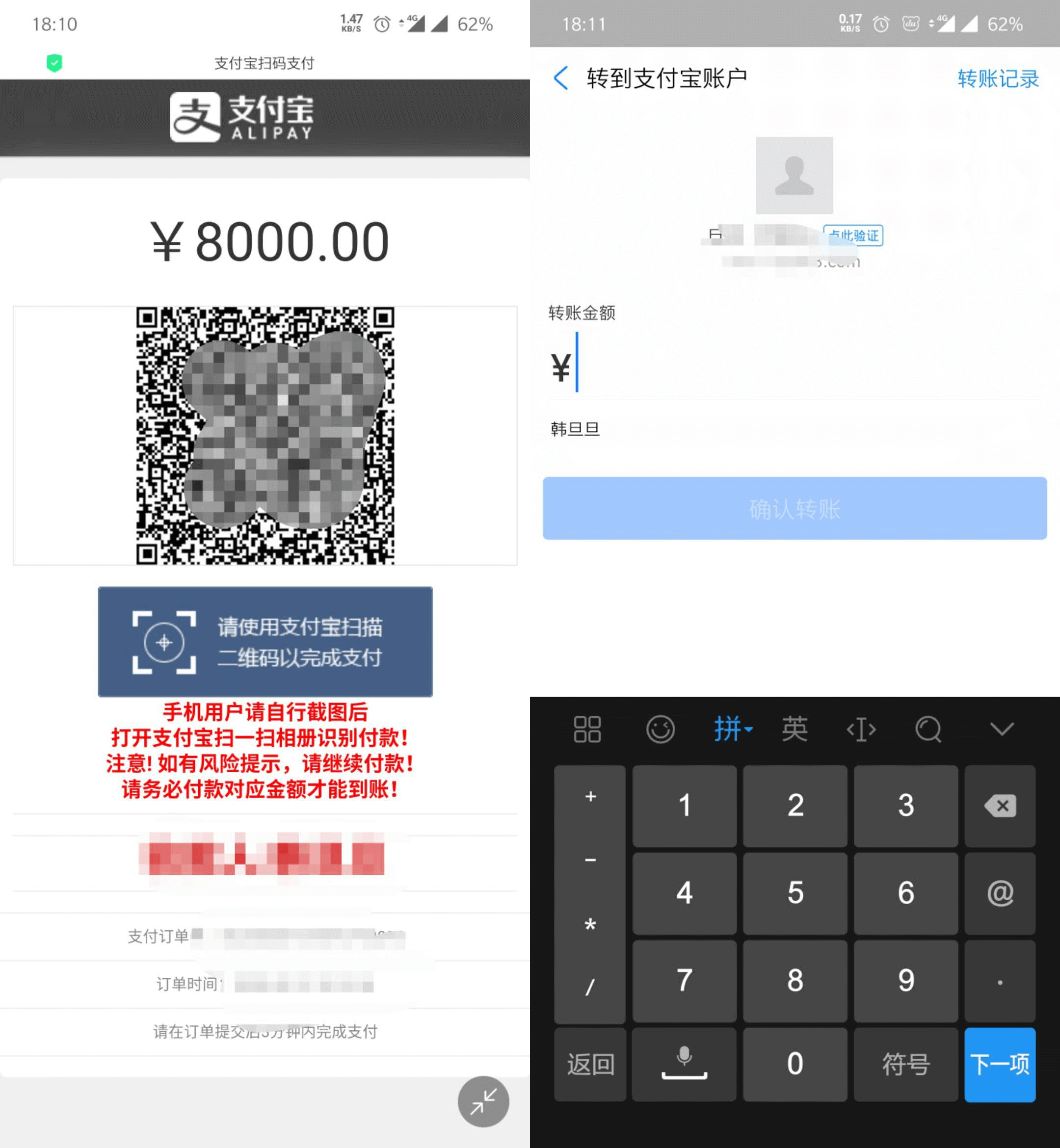 前面还是一样的,首先会下单然后应该是返回了一个URL然后拉起了原生浏览器。经过了N个重定向后出现了一个页面,从这个页面开始就不一样了,提示正在匹配订单,订单匹配成功后显示一个二维码,提示保存下来然后用支付宝扫一扫进行支付,用支付宝扫了以后发现它是向用户转账。然后我就懵逼了这怎么做对应