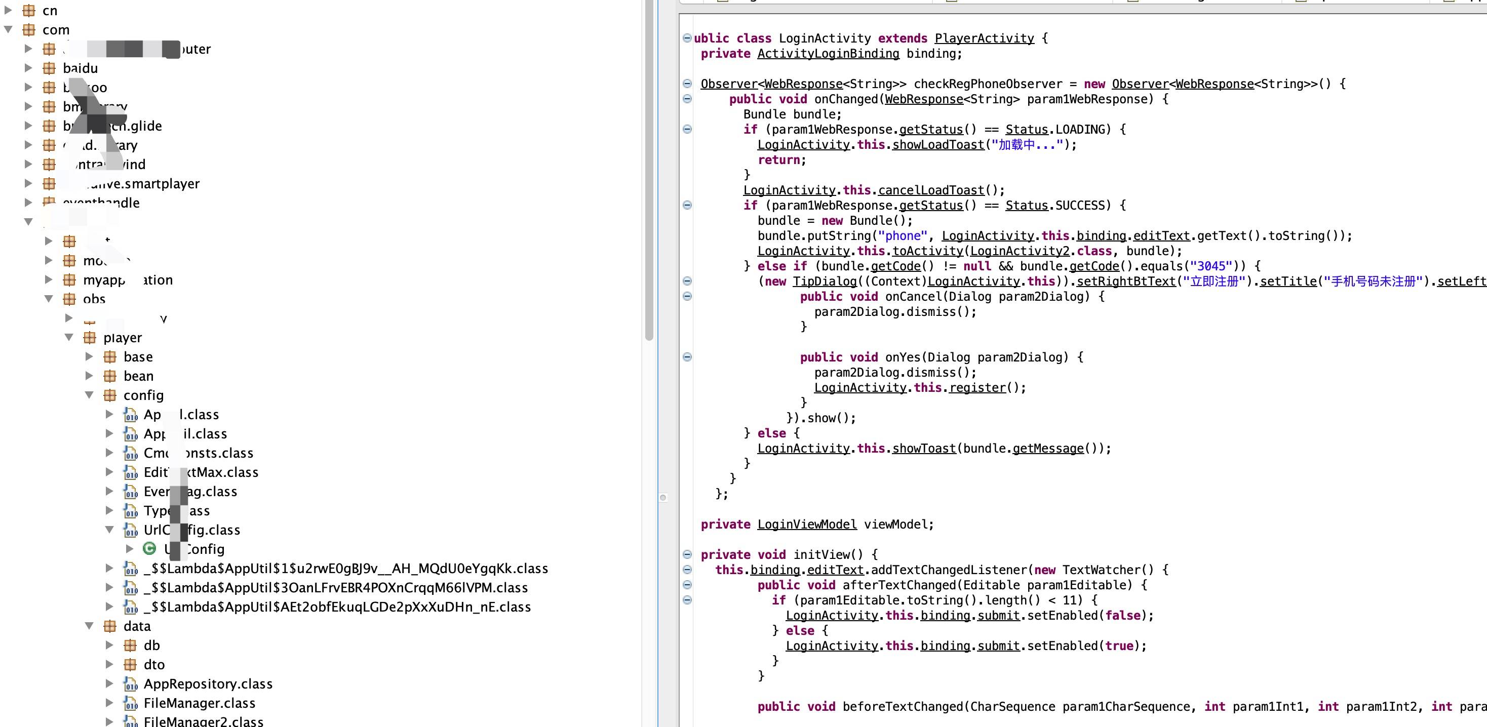 解压apk发现里面有两个dex,就感觉应该没有做加固,然后用dex2jar反编成jar包在JD-Gui中查看发现能看到代码,说明这玩意真的没有做加固。然后把Apk拖到AS中点开AndroidManifest.xml 找到包名(因为直接打开是编译后的xml这里就不多做说明了),然后在JD-Gui中找到对应包名的代码,发现。。。 这玩意连混淆都没有。还用上了DataBinding