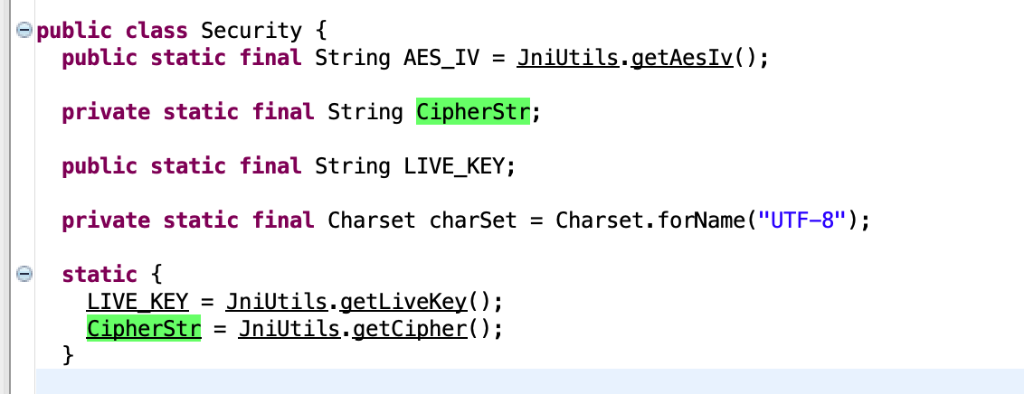 在Security加密类中 有几个已经直接放到静态变量里面了,那我为啥还要hook getCipher和getAesIv的返回值呢,直接把CipherStr和LIVE_KEY的值给反射出来不就好了嘛 。